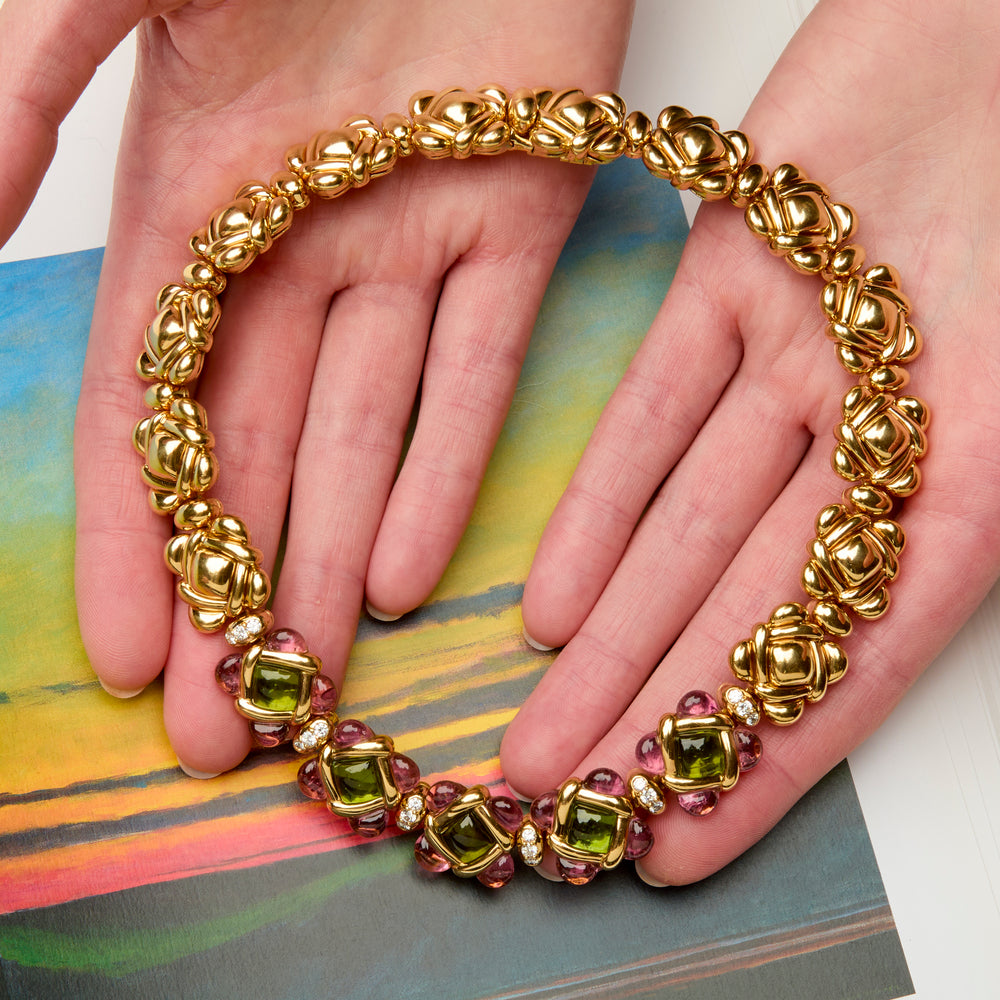 In this rare 18k gold sculptural necklace, Van Cleef & Arpels has reworked their classic clover design in delicate pastel shades. The five central clover-form links feature cabochon peridots edged with pink tourmalines and are separated by diamond accented spacers. The pink tourmalines seem to burst from their settings, radiating a sense of abundance. In the eight generously-sized gold clovers, the central gold element rises slightly from the heart of each motif.