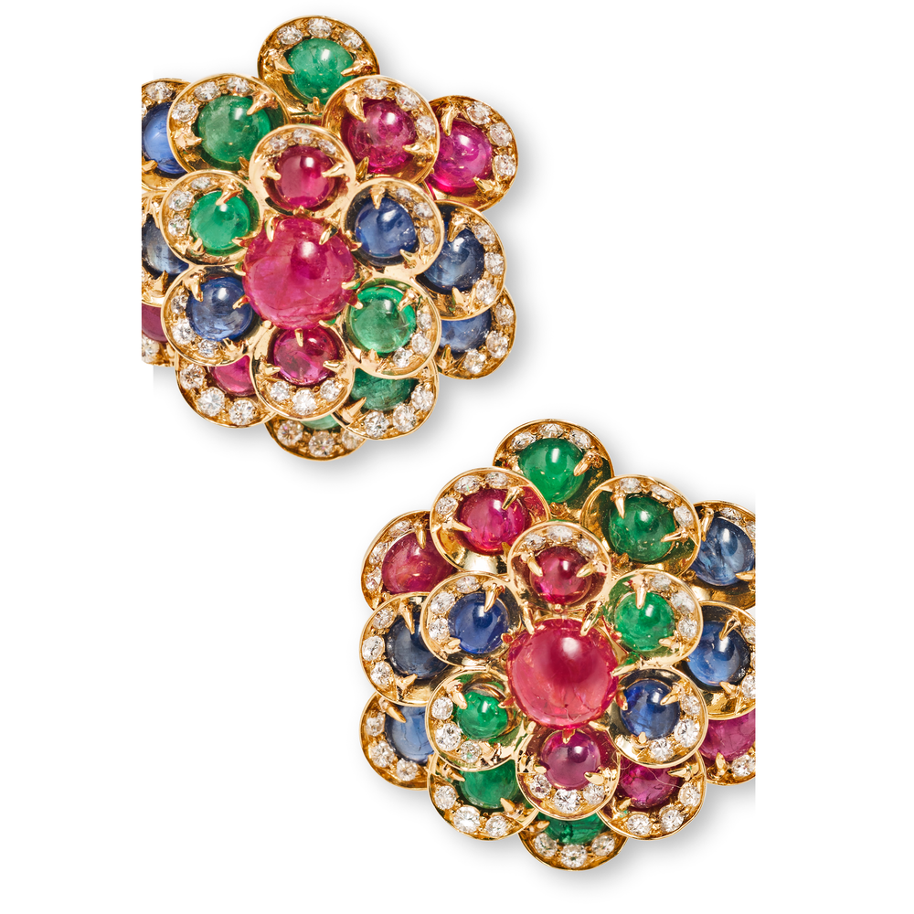 The colorful and vibrant aesthetic that we associate with Bulgari’s most iconic work flourished in the 1960s. The decade saw Hollywood stars and the jet set flock to Rome where the carefree modernity of La Dolce Vita was captured in Bulgari’s glamorous gem-laden jewels. These dynamic ear clips represent the best of Bulgari’s exuberant style.
