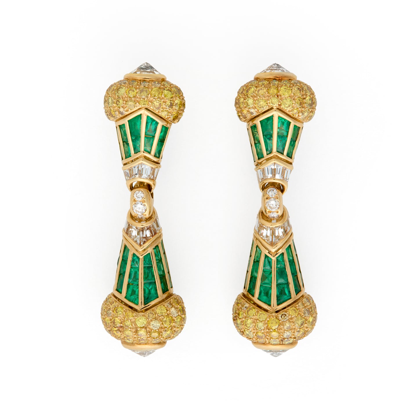 Bulgari Emerald, Yellow Diamond and Diamond Ear Clips, Circa 1980