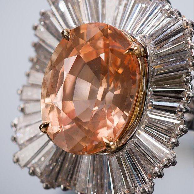 This natural 7.70 carat orange oval sapphire lends a dramatic twist to this cocktail ring. Further enhancing the center stone is a sparkling 3.00 carat diamond "Ballerina" halo surround. Rare in color and not mined in great quantity, orange sapphires are sought after by discerning collectors. AGL report states the sapphire is natural without heat or clarity enhancement and is of Ceylon/Sri Lankan origin. Set in 18k gold. The ring is size 9 and can be easily resized.