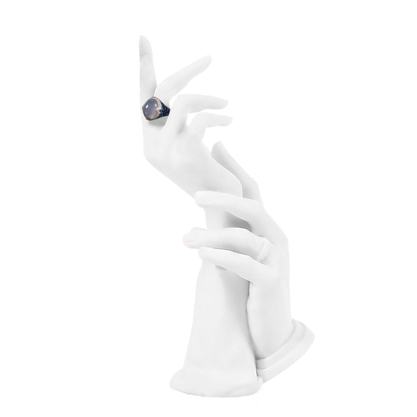 Asprey demonstrates how stones can work together to create a piece that is truly exceptional. The center stone of this ring is a luscious 22.47 carat blue cabochon chalcedony surrounded by a collar of vibrant diamonds and enhanced by an exposed shank of deeply saturated blue sapphires. Chalcedony is a semi-precious stone favored by some of the masters of 20th century jewelry including Verdura and Suzanne Belperron, who was commissioned by the Duke of Windsor to design a stunning suite of blue chalcedony jewelry for Wallace Simpson in 1937, the year of their marriage.
