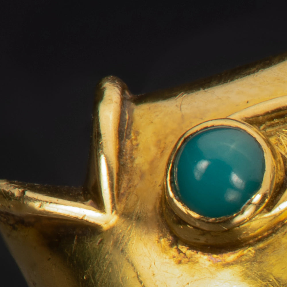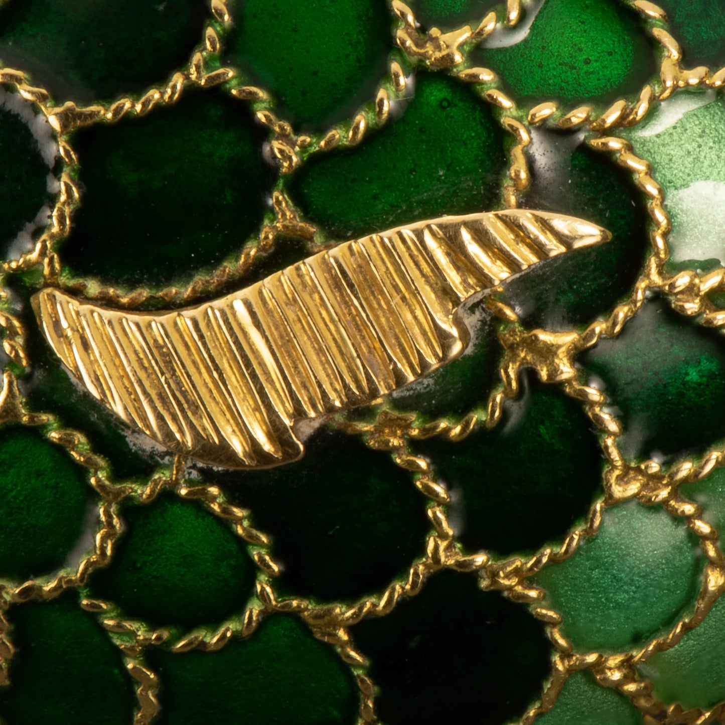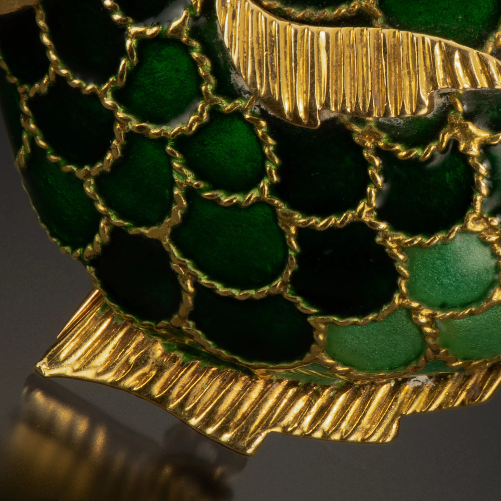 This vintage gold and enamel fish brooch illustrates the playful side of Boucheron. Shades of green enamel form the scales, and the 18k gold head is set with a cabochon gemstone eye.