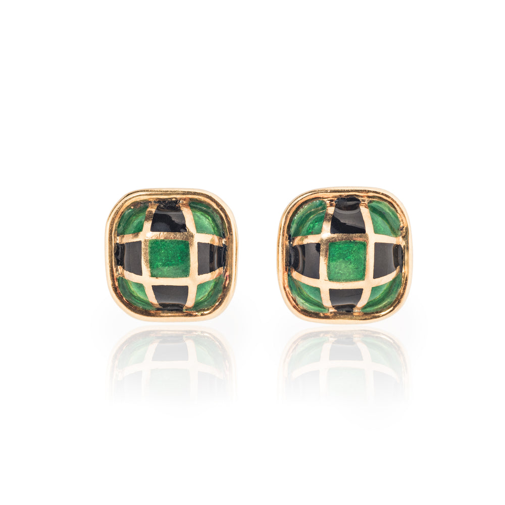 A daring color palette of black and green enamel is used to create a checkerboard design in this elegant pair of David Webb studs.