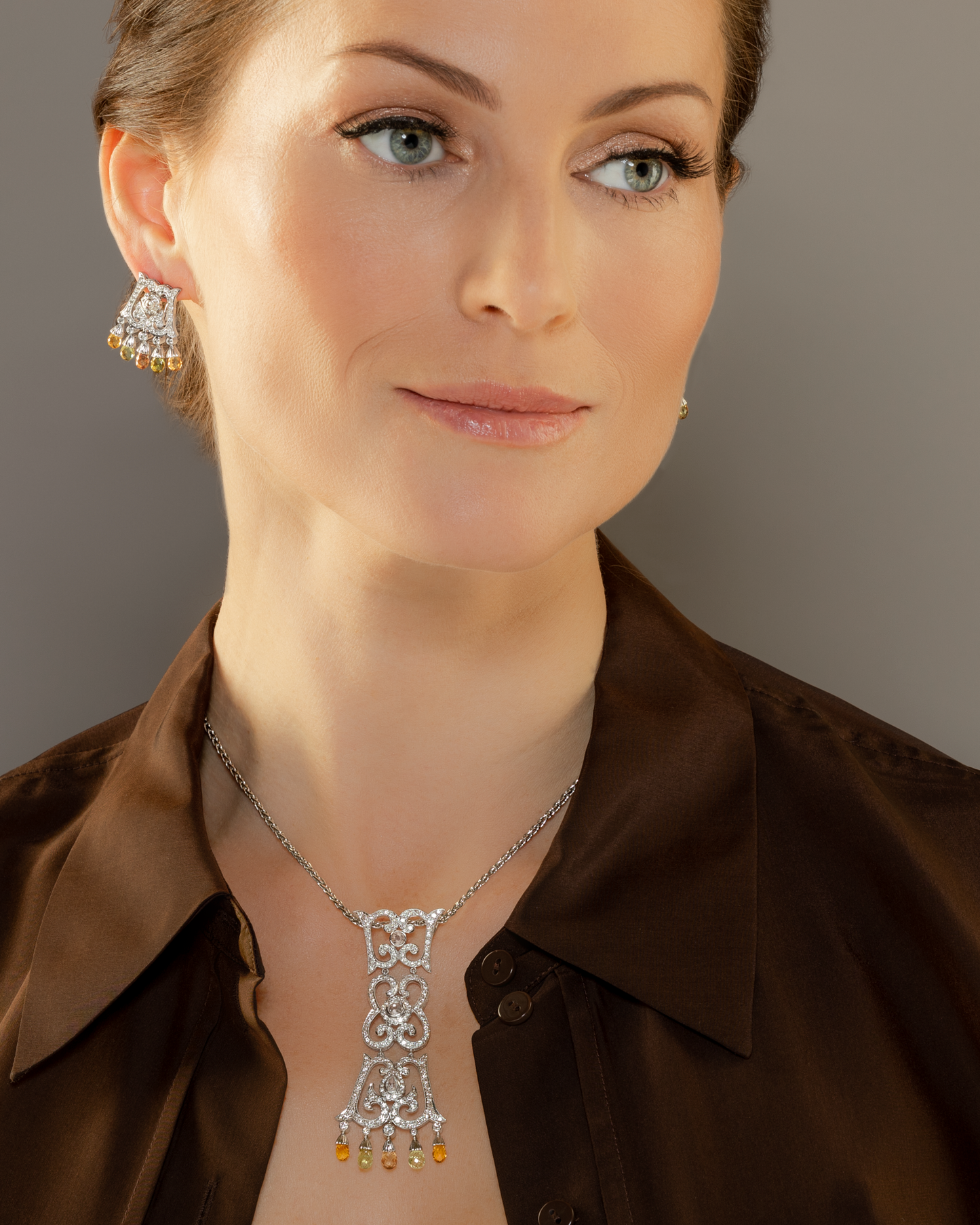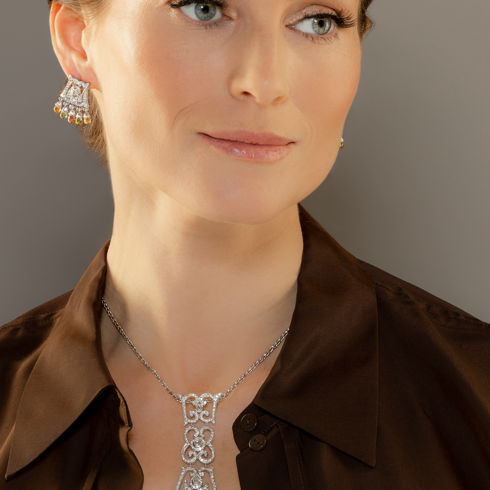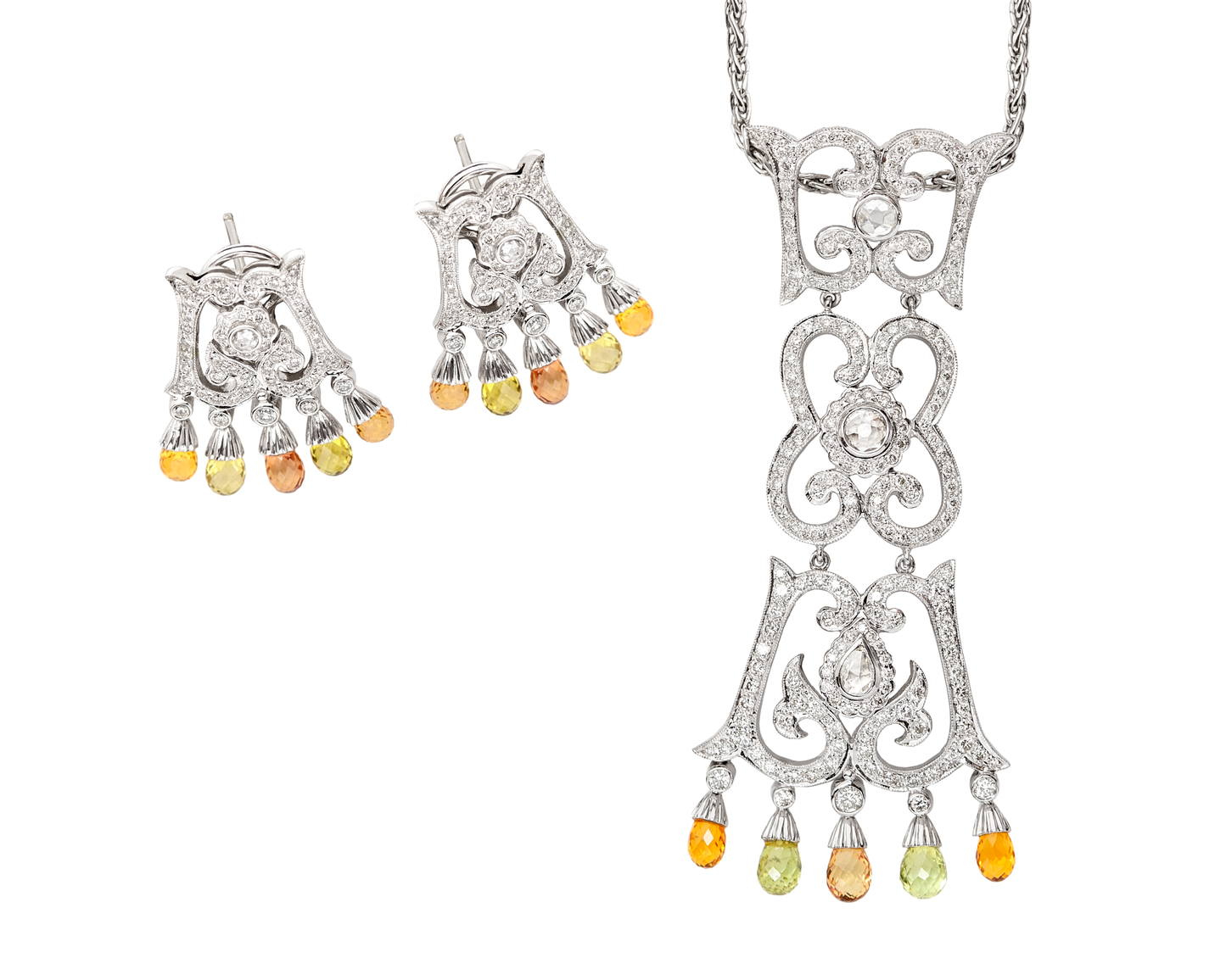 These 18k white gold openwork earrings are set with full-cut diamonds, terminating in a fringe of briolette-cut fancy colored sapphires. The briolette-cut originated in India about 800 years ago and reflects light from all angles. This is known as “the chandelier effect”.