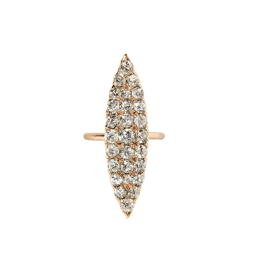 The navette form is an antique shape dating to the Victorian era that rests elegantly on the hand. This diamond studded version makes a refined statement as it gracefully elongates the finger and catches the light.