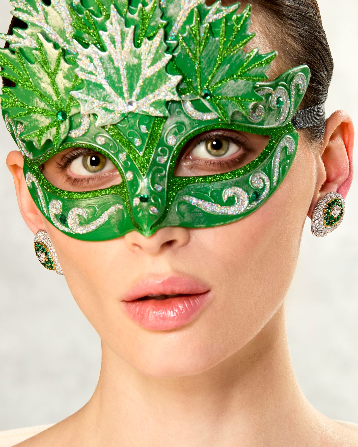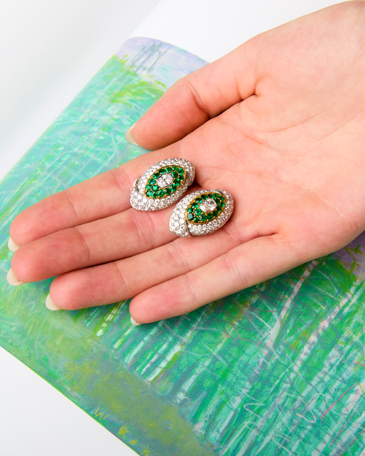These emerald and diamond ear clips fit the FRED DNA perfectly: crisp, wearable glamour with the real headline being COLOR: the vivid green of the emeralds. The ear clips are a flattering almond, slightly bombe shape. Inside a smaller almond shape delineated by small gold trim, are sixteen bright emeralds surrounding a central diamond of approximately one half a carat. This central element is framed by a surround of diamonds that display a subtle turban effect: one diamond-set section barely folds over another creating an overlapping impression.