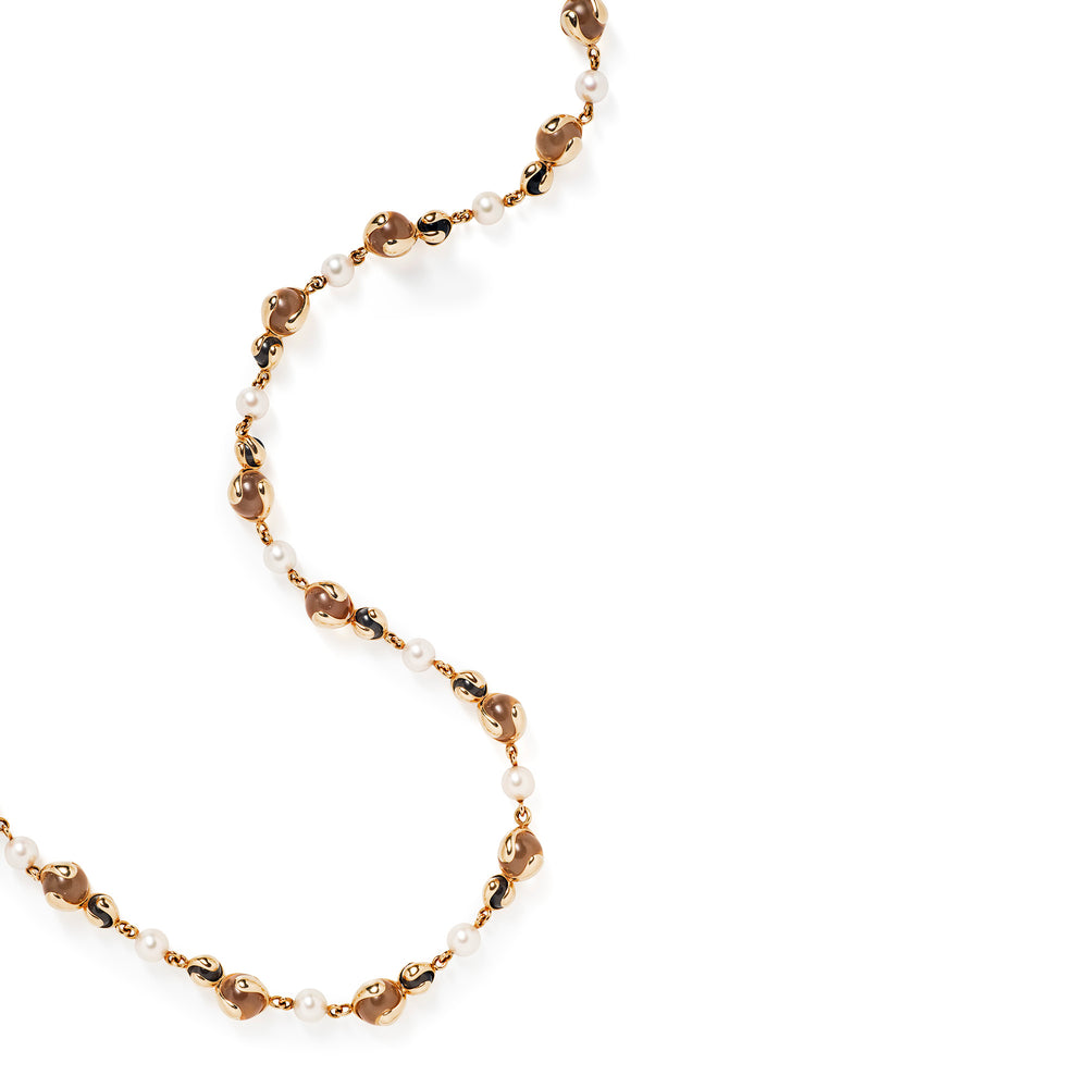 Marina B’s designs are known for their graphic lines, bold color choices and elegant ease. This long station necklace from her late 80s Cardan Collection is designed as a series of citrine and onyx beads set within 18k yellow gold crescent-shaped caps spaced by cultured pearls. It can be worn long or doubled to form a choker.
