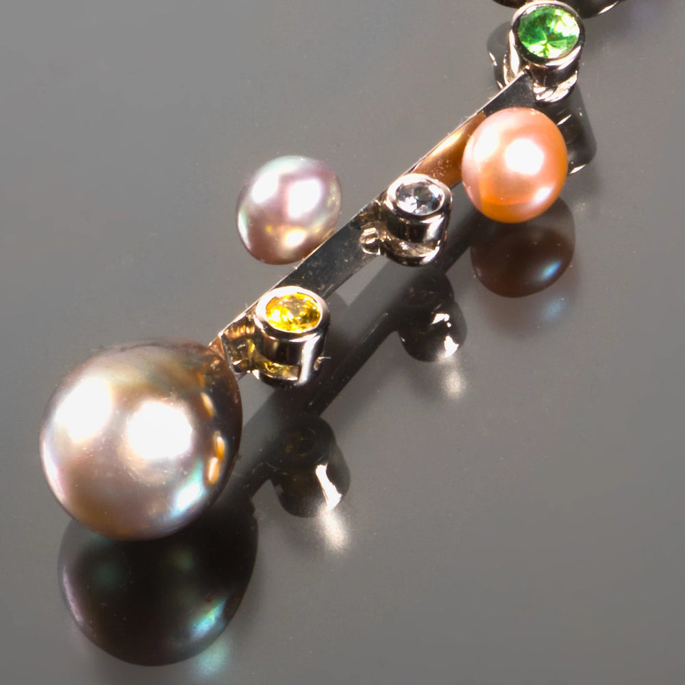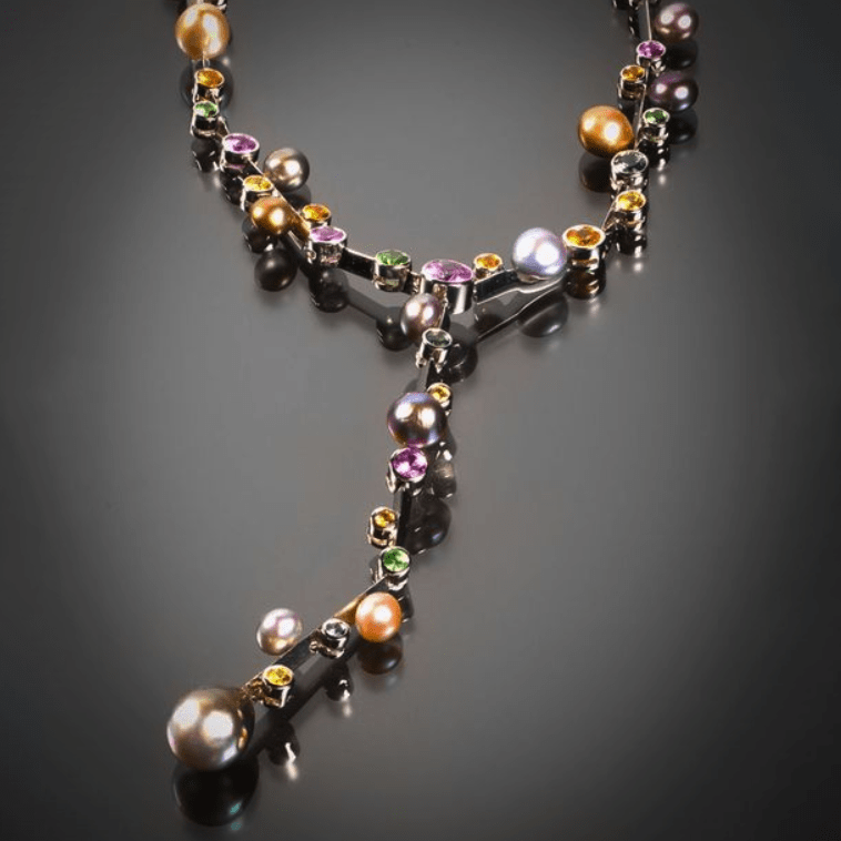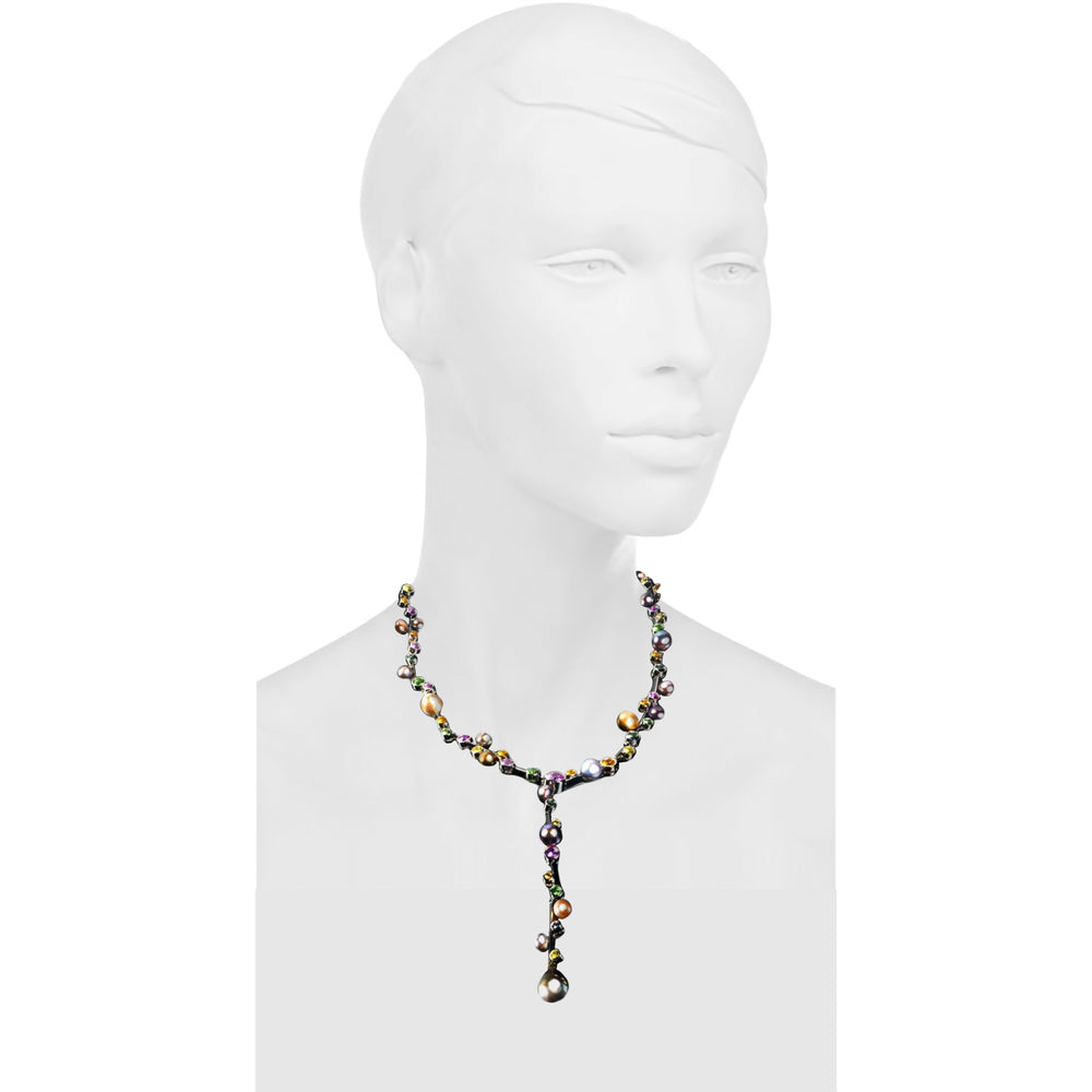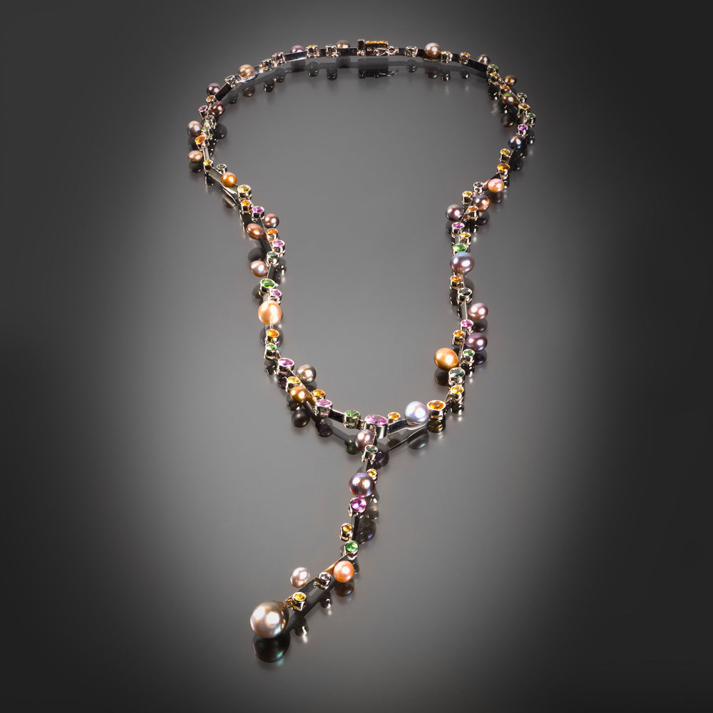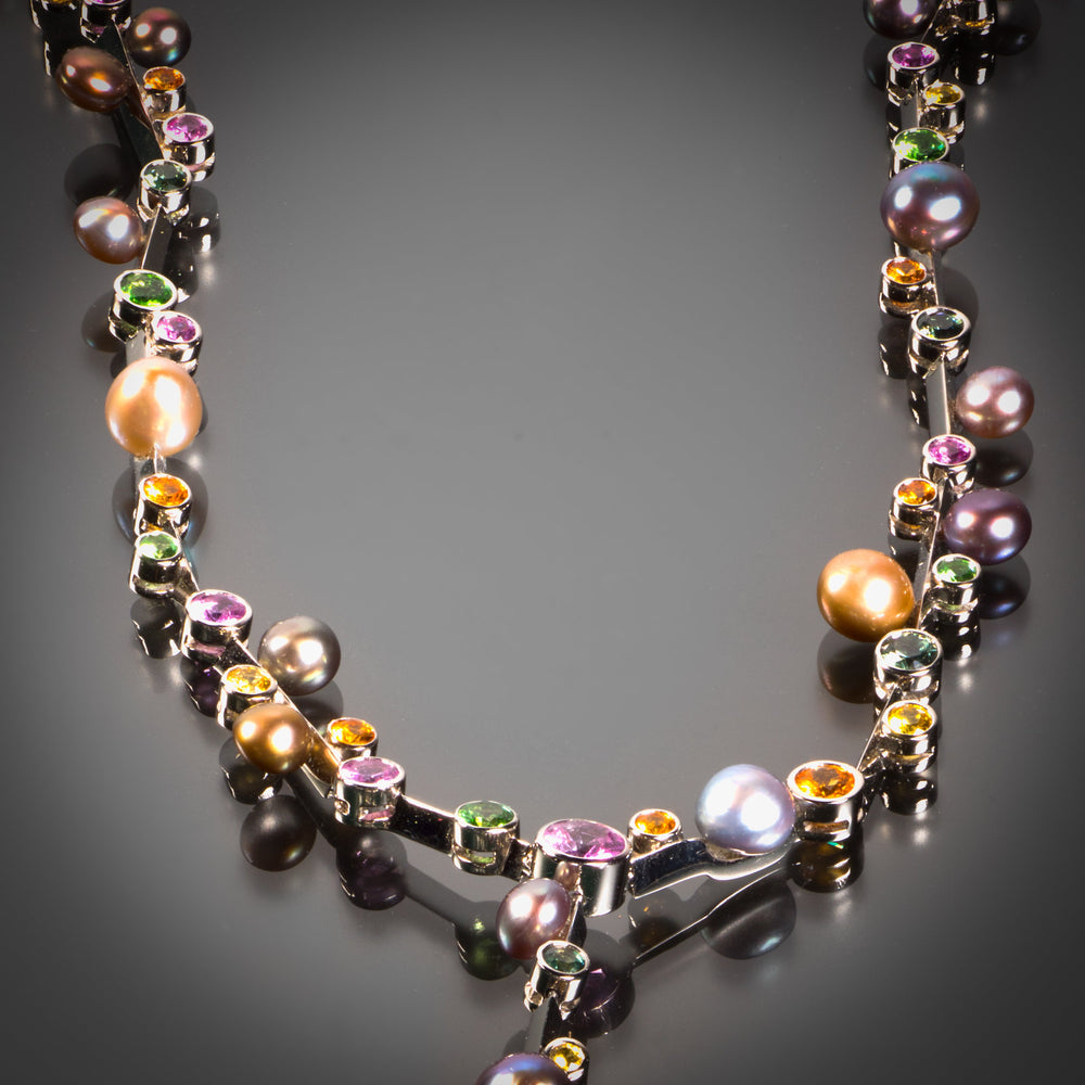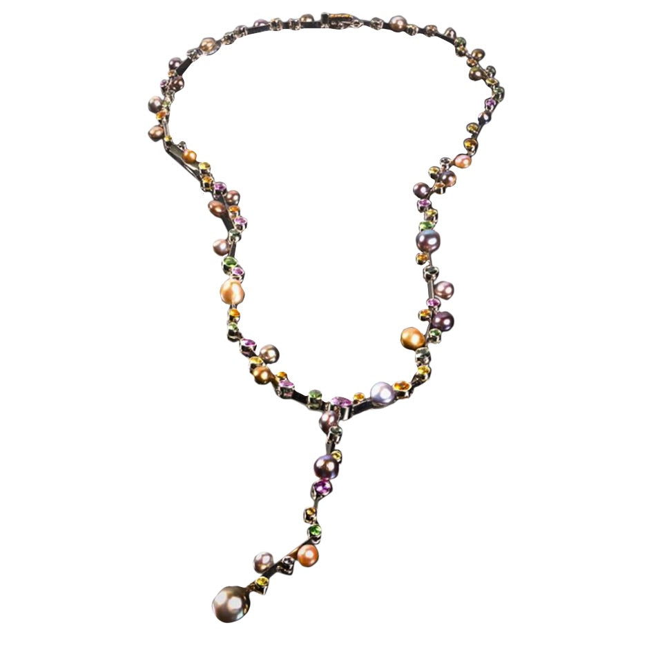 This sophisticated gem set necklace takes a modern approach to colored stones. Vived-hued sapphires in shades of pink, green, blue, orange and yellow are randomly placed along a flexible white gold necklace, while rare natural pearls of varying sizes and colors are scattered between.