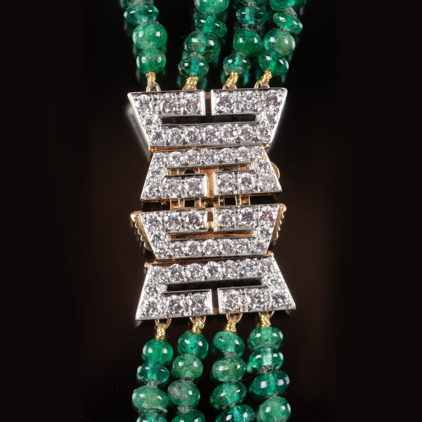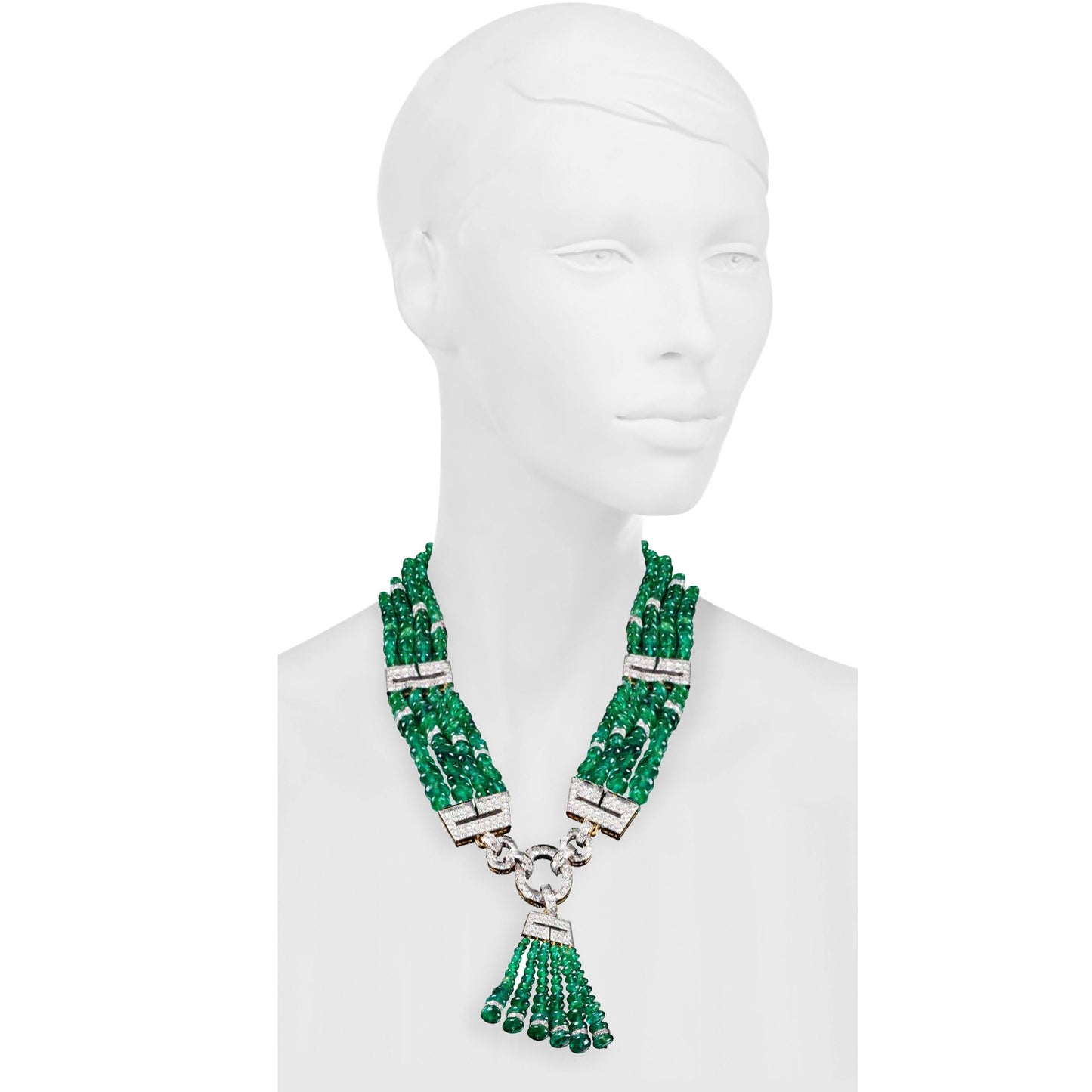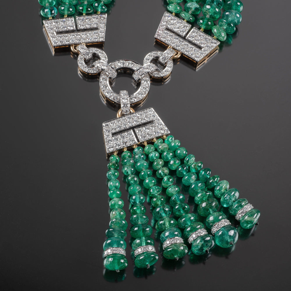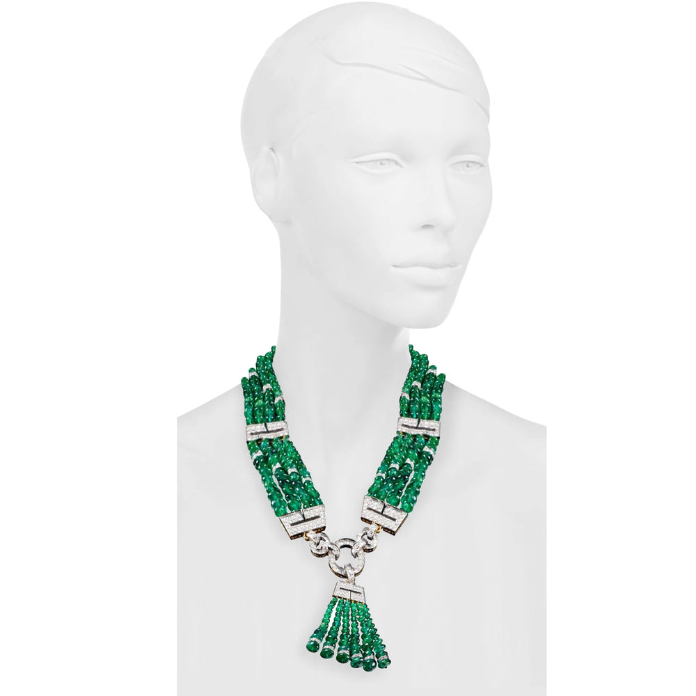 This magnificent David Webb emerald and diamond fringe necklace is a one-of-a-kind vintage treasure created for a longtime client of Webb’s. It is composed of four graduated rows of emerald beads interspersed by Art Deco-inspired openwork panels pavé-set with round brilliant-cut diamonds, further accented by similarly cut diamond-set rondelles.