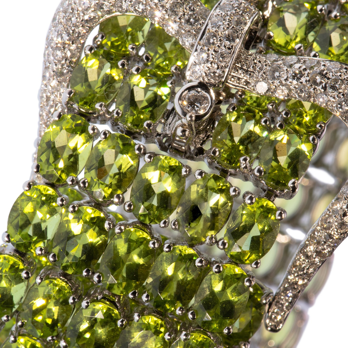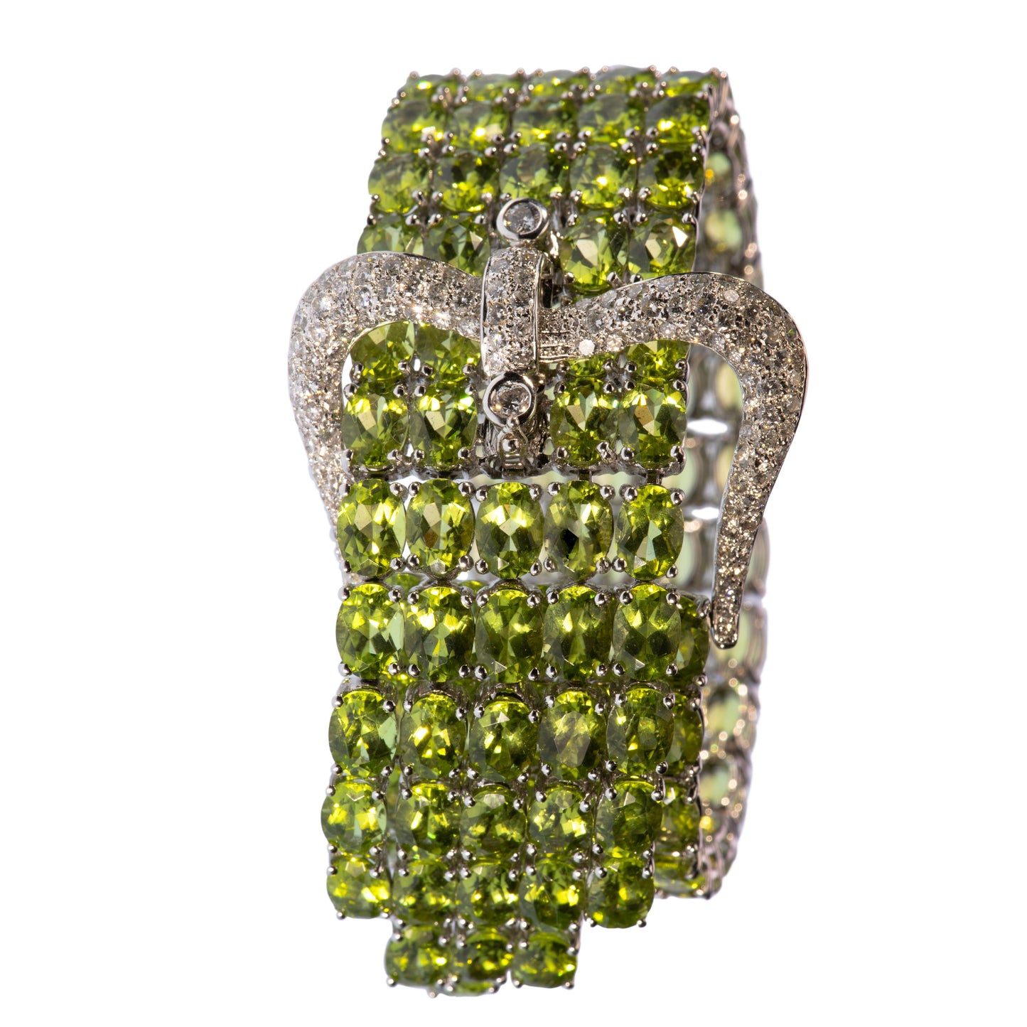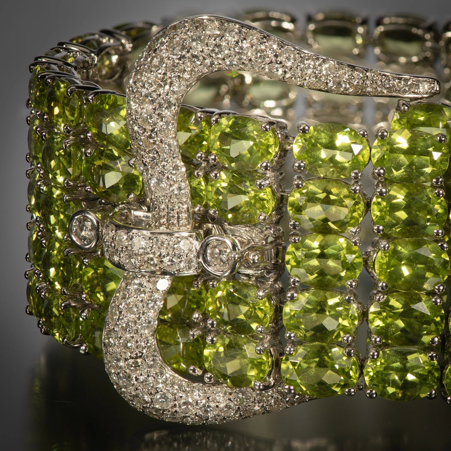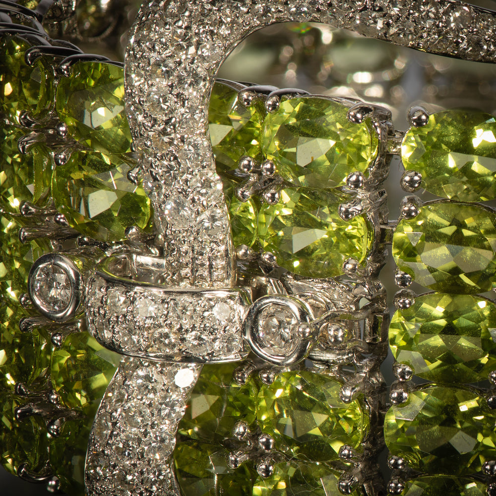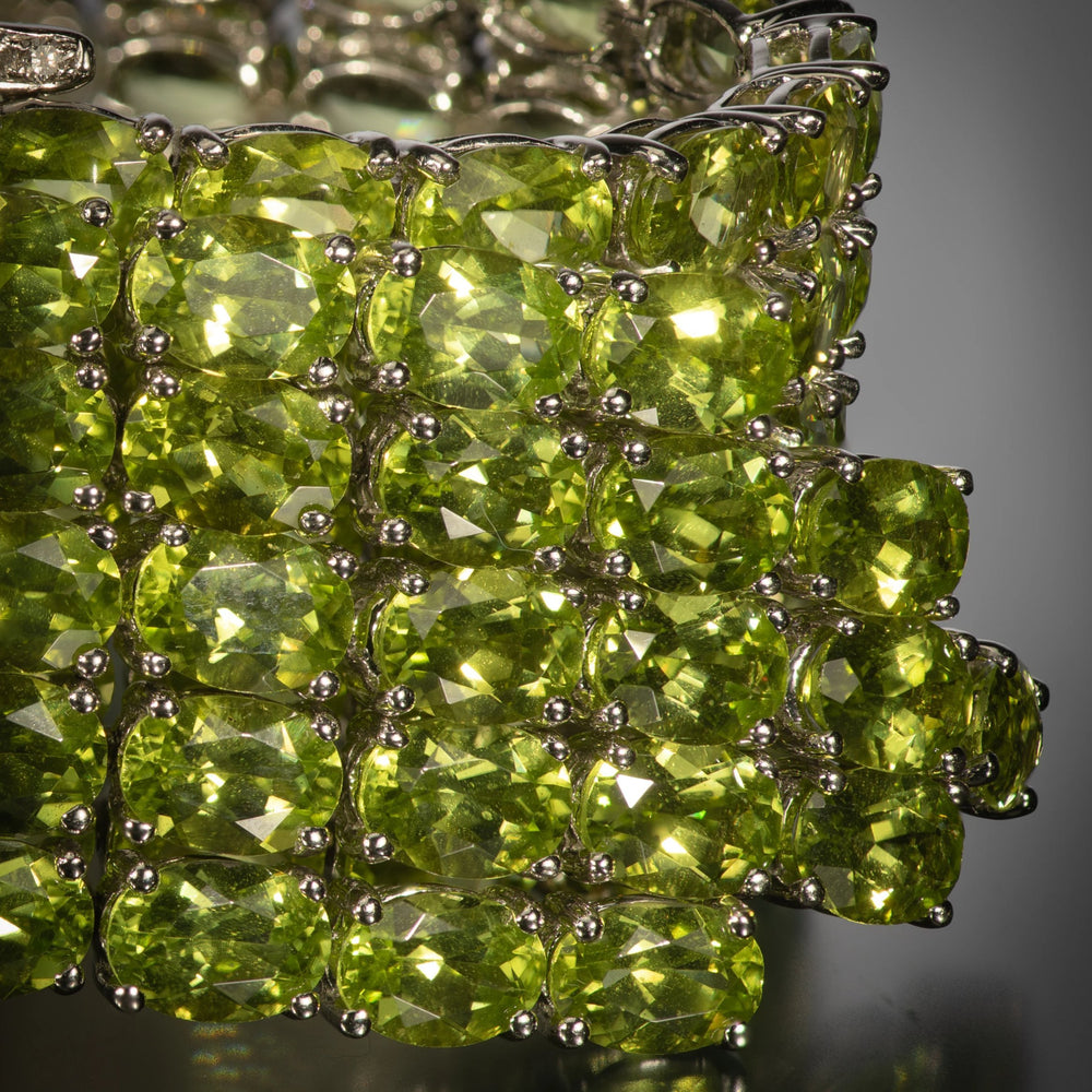 A wide strap of bright green peridots wraps around the wrist, ending in a flourish of peridot fringe. The bracelet is secured by a crown-shaped buckle set with over 2 carats of bright white diamonds. The peridots are the most desirable shade of apple green.