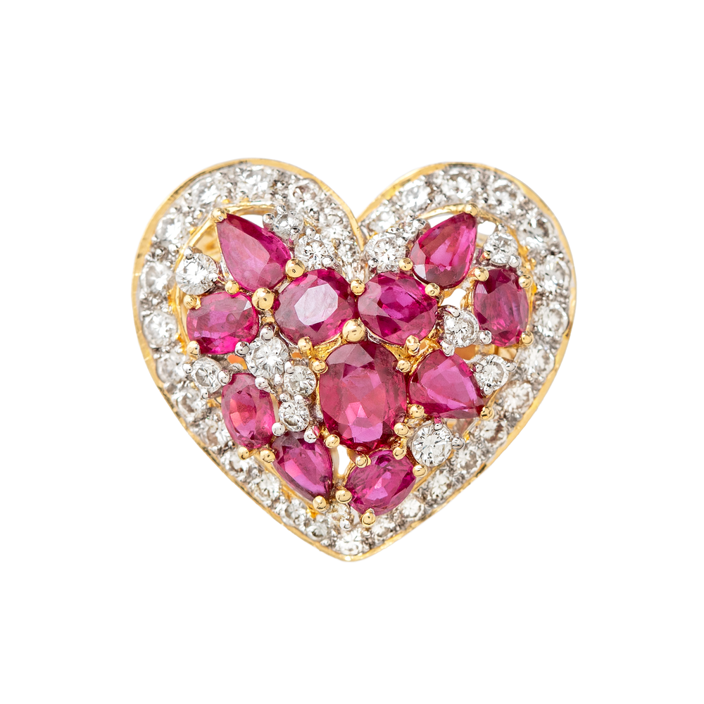 A heart-shaped ring set with oval and pear-shaped ruby clusters accented by round brilliant-cut diamond surrounds.
