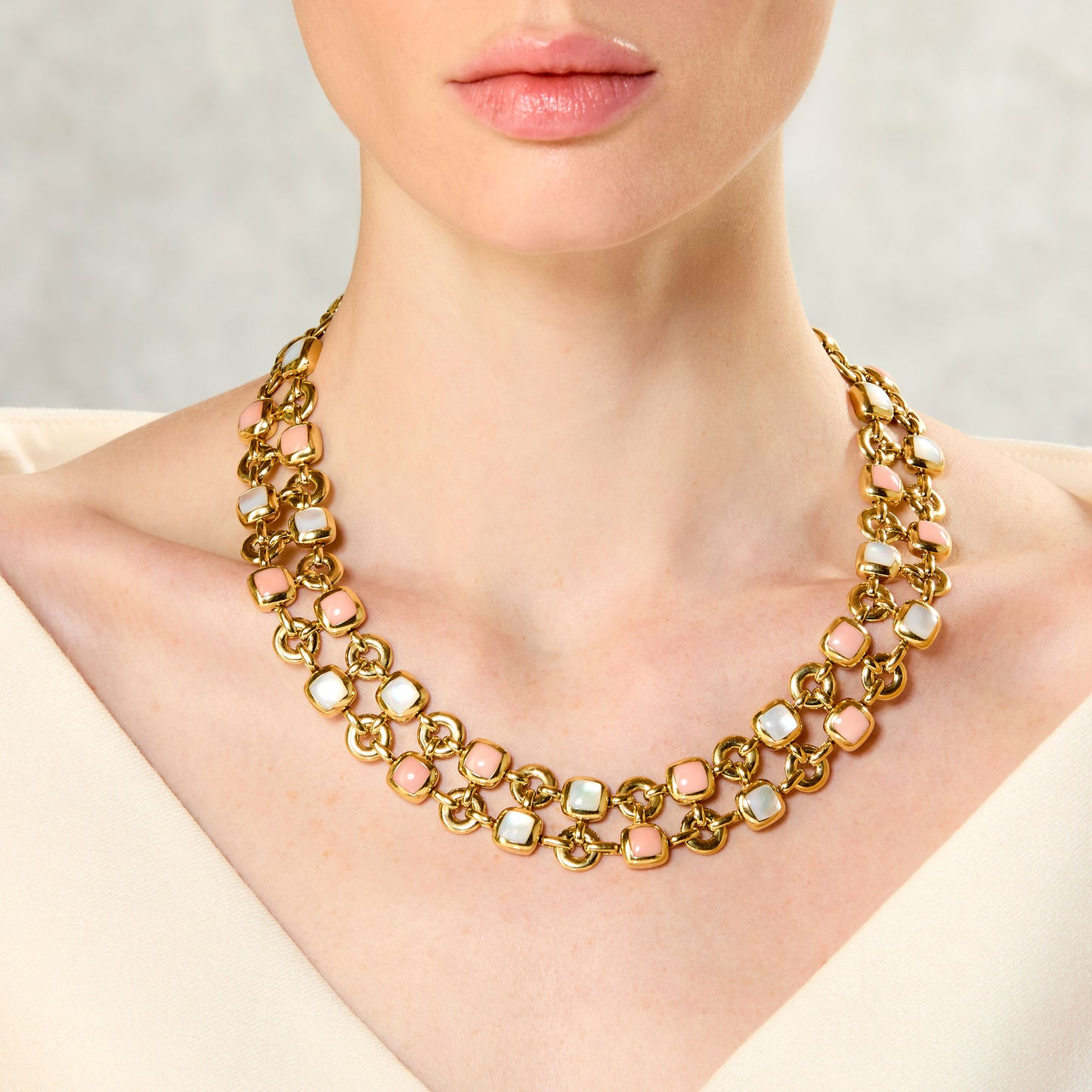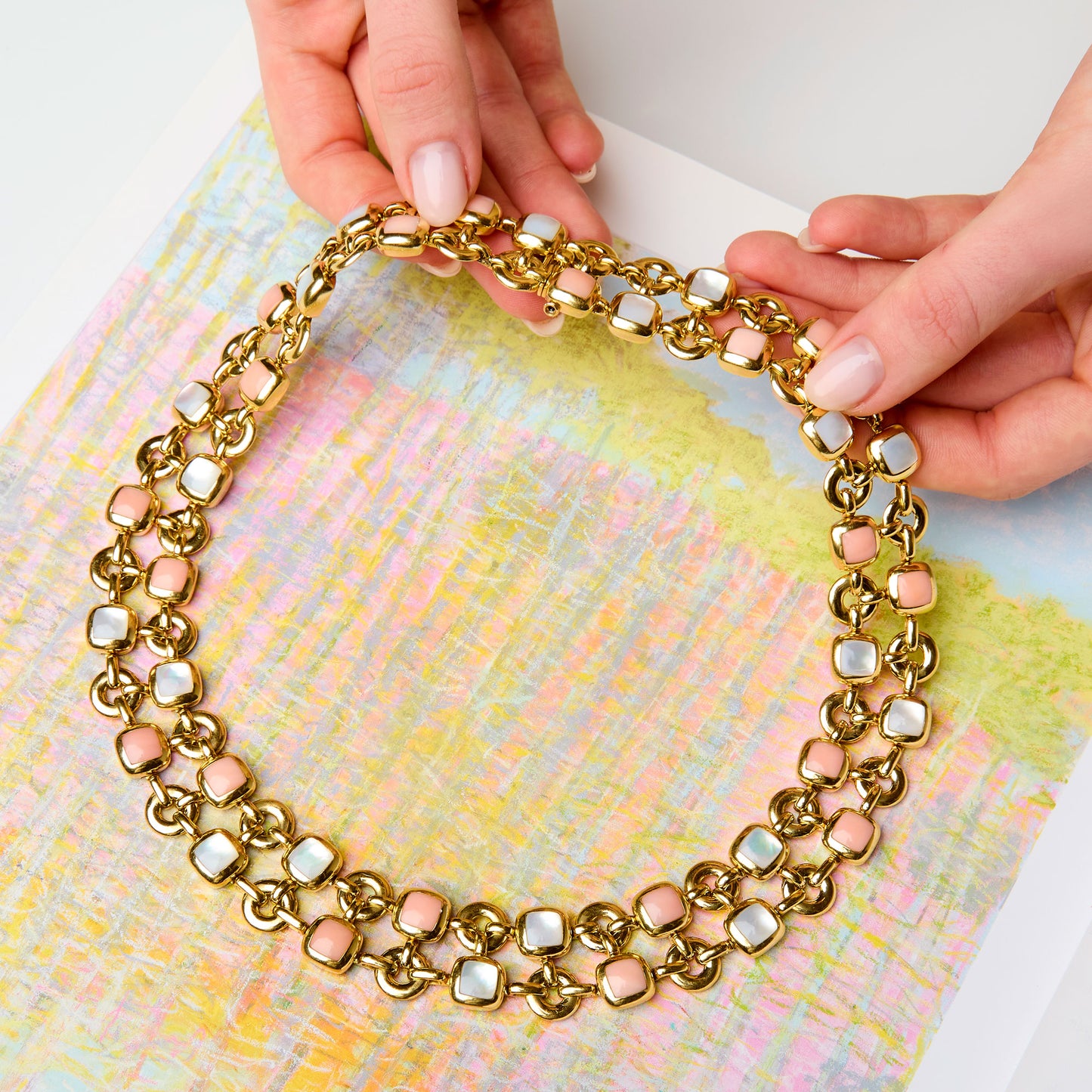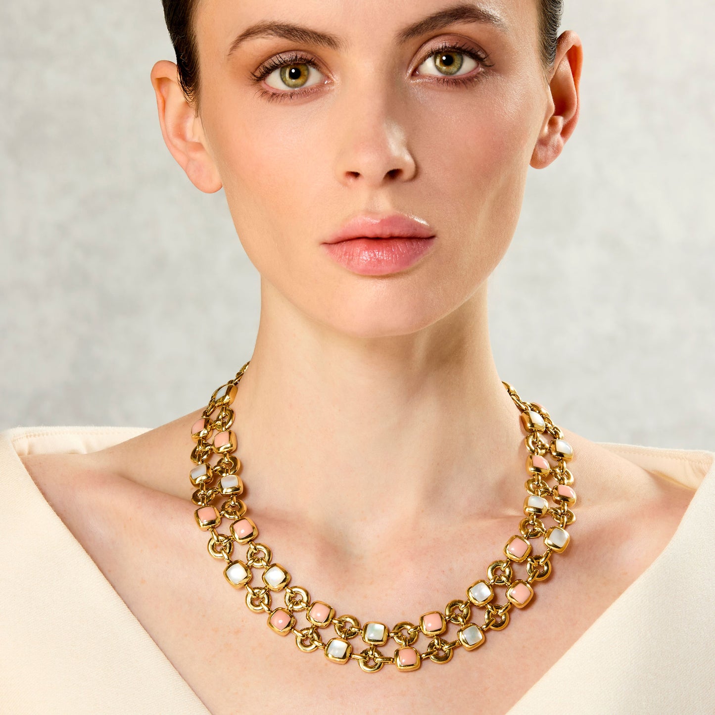 This striking double-stranded necklace is set with alternating bezel-set angel skin coral and white mother-of-pearl squares each separated by round open gold links. The interplay of the square and round links introduces a rhythmic sense of movement and continuity, allowing the necklace to transition seamlessly from tailored daytime wear to refined evening elegance. It is from a limited edition of hand-made pieces.