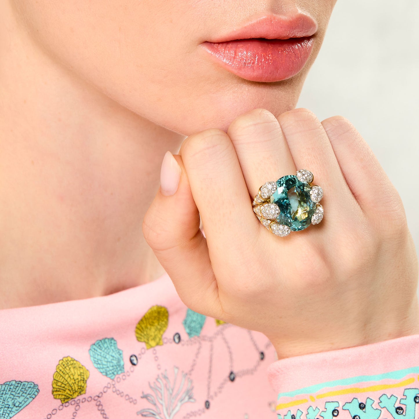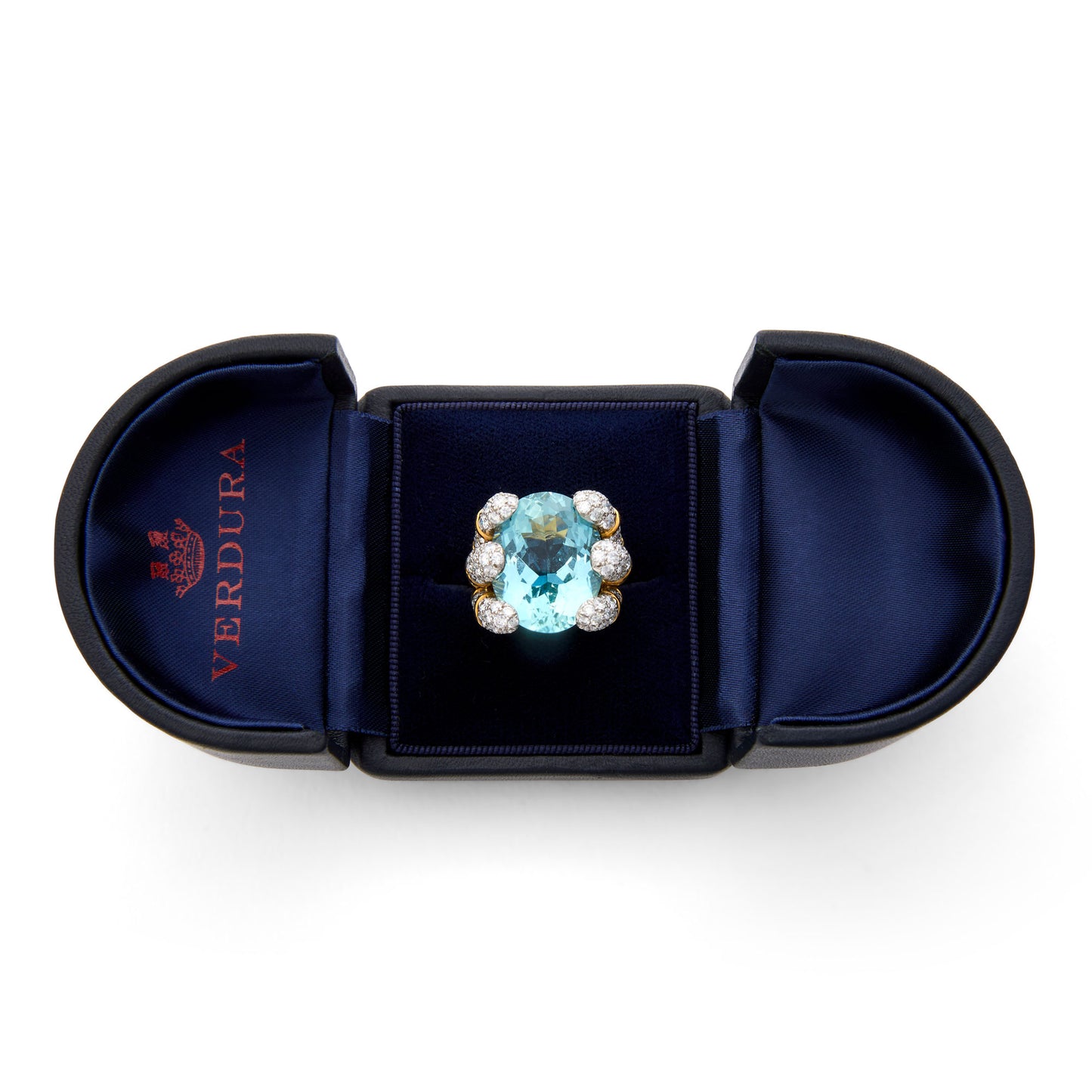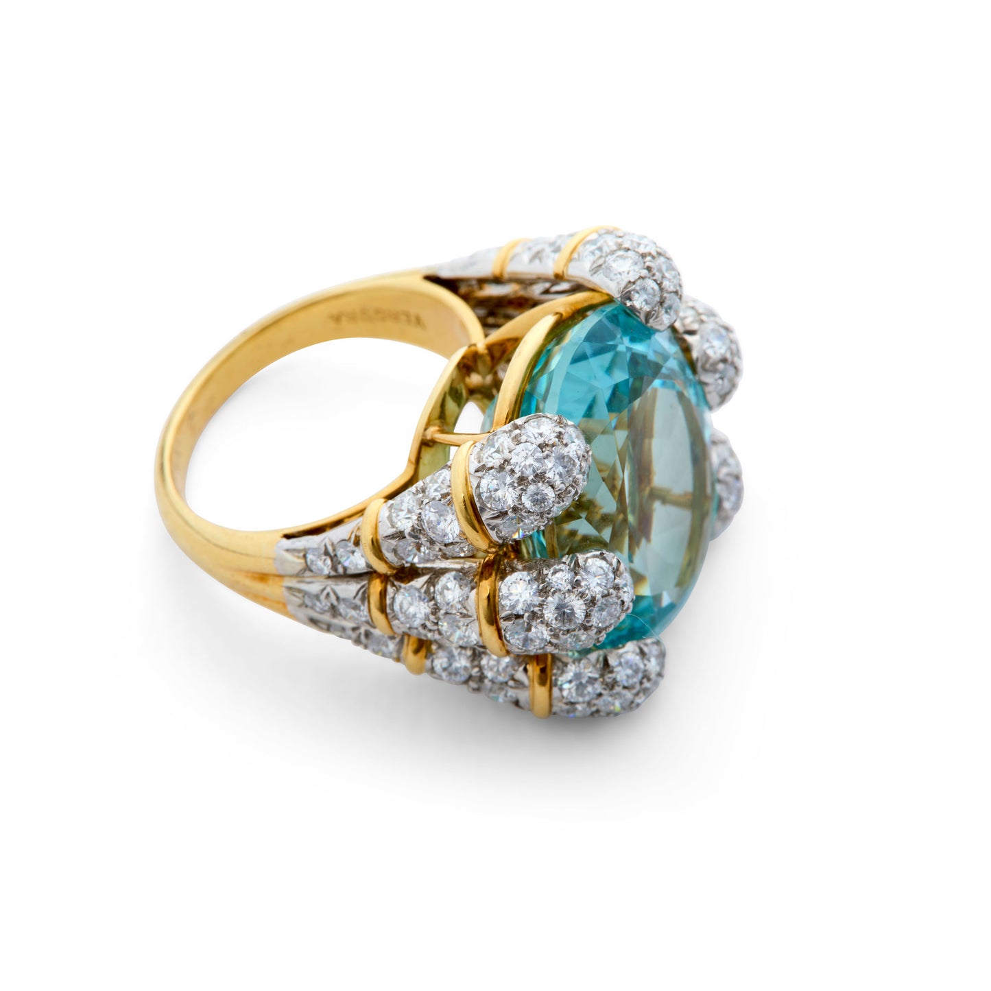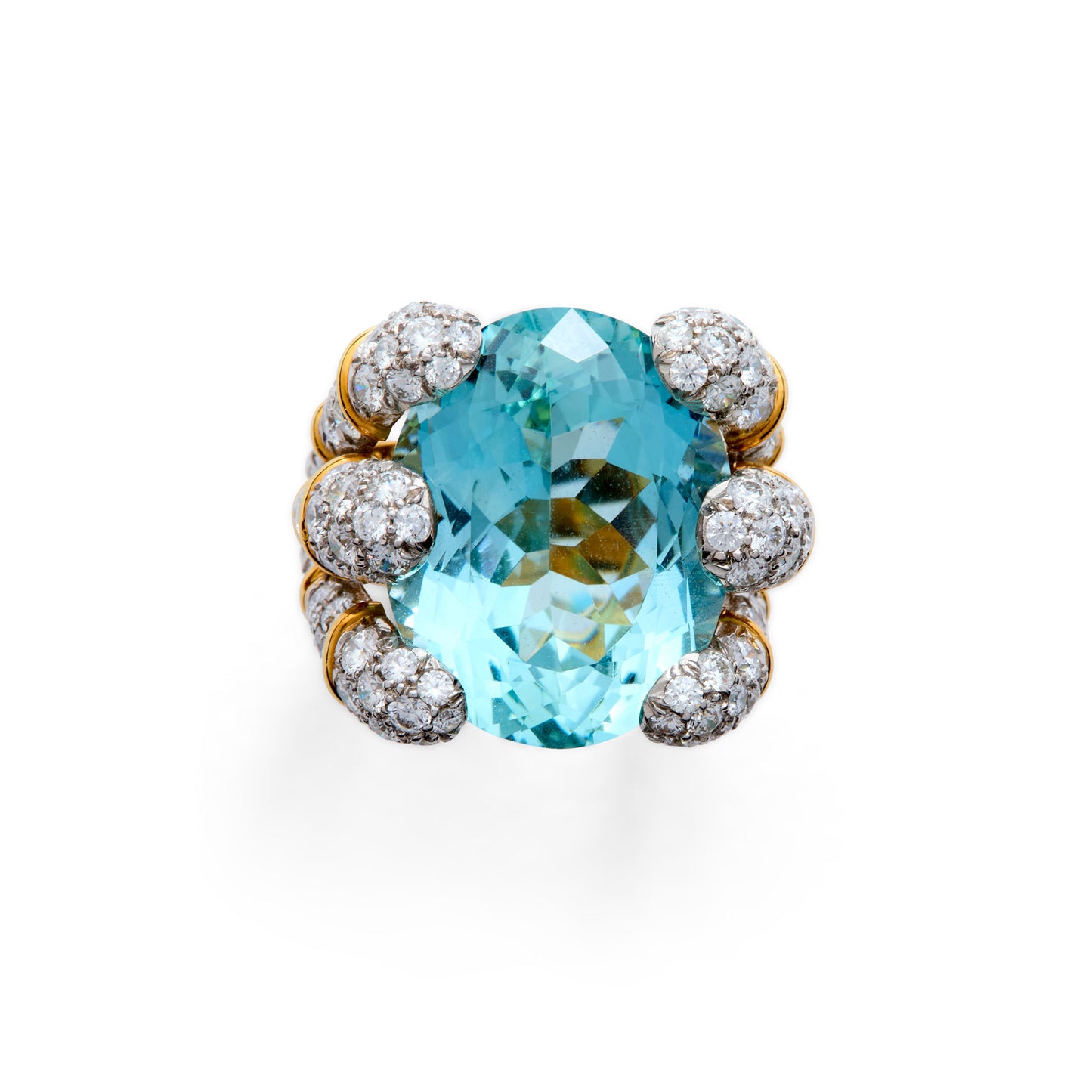 This ring is a “Blades” ring set with a cushion-cut aquamarine of approximately 20 carats held within the sculptural six-blade mounting, the blade-form shoulders pave-set with diamonds. This setting was created by Verdura to create an architectural play of light and volume for large consequential gemstones which demanded a design equal to their quality and presence.