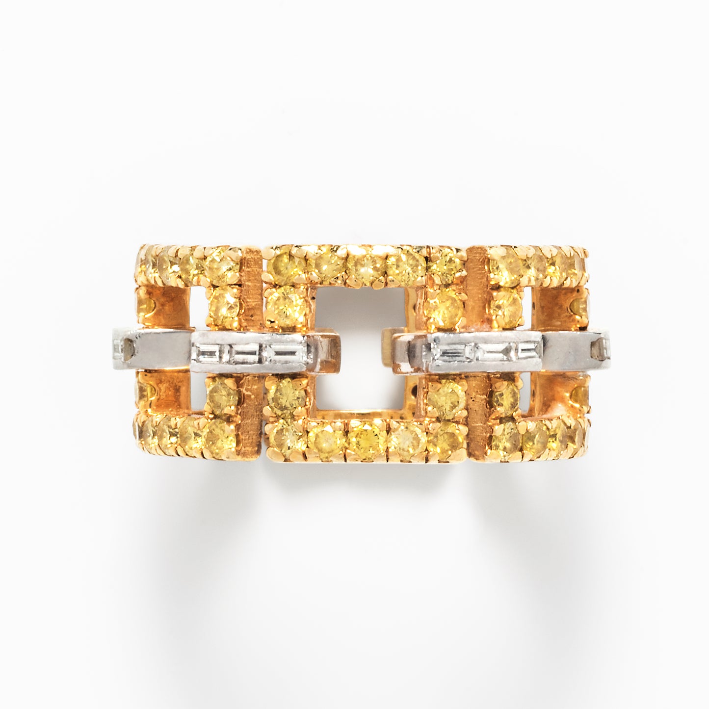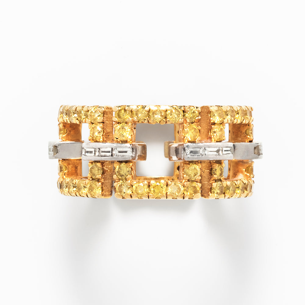 Yellow and white diamonds create a series of open-work rectangular-cut panels in this ring. The canary yellow panels resemble windows open to bright sunshine with the baguette white diamonds providing fiery punctuation in between. The total diamond weight of this ring is 3.50 carats. The ring is 18k gold and platinum. The size is 7.5.